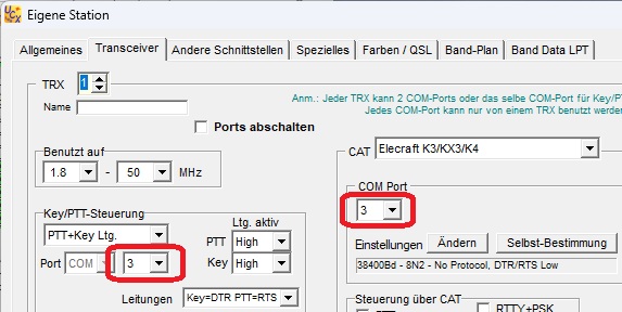 Es darf auch dasselbe COM-Port wie für CAT-Steuerung (s.u.) verwendet werden (außer bei WinKey).