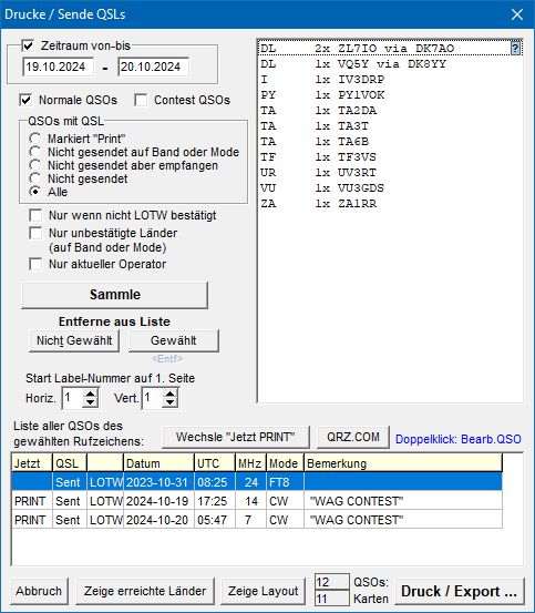 ich habe im WAG-Contest eine Station mehrfach gearbeitet. Fuer den Contest habe ich eigentlich keine QSL gedruckt. Der Druck für Oktober ist dann ohne WAG geschehen Nun wollte ich nachtraeglich die QSL noch drucken. In "QSL Druck" das richtge Datum eingestellt und auch im Log in dem QSO "P" zusaetzlich eingetragen. Aber bei "Sammeln" taucht das QSO nicht auf.( S. Unten die zwei Fenster: Logauszug, "QSL-Druck")